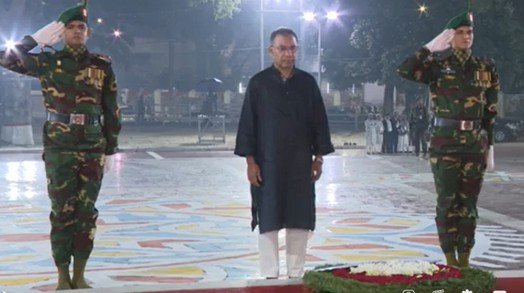 রাষ্ট্রীয় কর্মসূচির অংশ হিসেবে রাত ১২টা ১ মিনিটে শহীদ মিনারের বেদিতে পুষ্পস্তবক অর্পণ করেন
